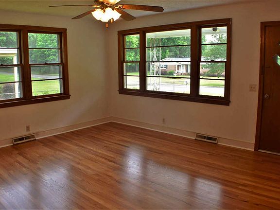 Located on a large corner lot, this three bedroom, one bathroom home is available today! The beautiful brick and inviting front porch will absolutely charm! You will love the separate entrances for the den and formal living room. This allows you to direct your guests to the formal living room through the front door and shut the doors on the den to hide the messes of real life. For example, the laundry that never ends! The laundry room is off of the den and has convenient access to the backyard. The spacious kitchen has a large eat-in area to fit the whole family. Wood floors and the identical wood-look linoleum run throughout the home so no carpet for kids and pets to stain! There is a huge outdoor storage room perfect for a workshop or storing your lawn equipment and all the outdoor toys you need to enjoy the fenced backyard. Affordably priced, this home is an excellent opportunity for first time home buyers and those looking to reduce costs in retirement. Check it out today!