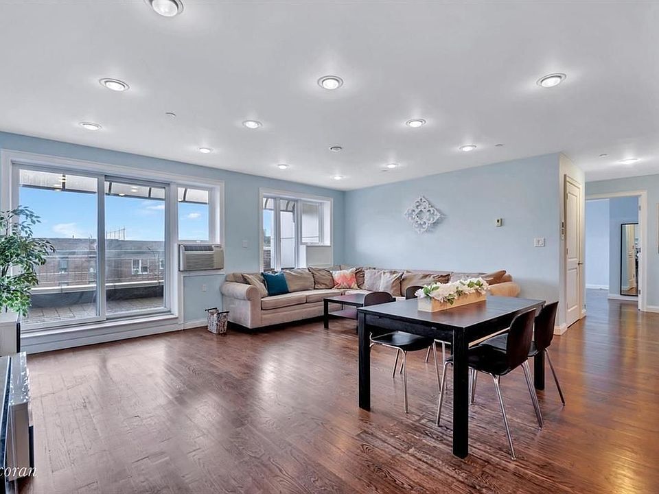 This palatial penthouse offers two bedrooms, two bathrooms and an amazing wrap around terrace with double access. This luxury apartment at the Waterfalls Condominium in Ditmas Park, Brooklyn features elongated windows, high ceilings with recessed lighting, solid oak hard wood floors, spacious modern living and dining layout, open chef's kitchen with white cabinets, new dishwasher, large granite counter top and plenty of cabinet space. Enjoy spectacular sunrises and treetops from your over-size terrace, with double access via your living room, as well as, your large master bedroom with spacious spa-like bathroom with a whirlpool jet tub. Washer and dryer are in the unit! This full service pet friendly building is conveniently located within close proximity to neighboring restaurants, cafes, lively night life and shopping by Cortelyou Road including the Farm on Adderly, The Purple Yam, Milk and Honey, Oxcart Tavern, Sycamore Bar + Flower Shop, Lea's, and Cafe Madeline, and several organic markets. The bright fitness room with a view into a large beautiful back outdoor common space with playground and communal grills for summer grilling, daily doorman from 8am to 8pm, resident superintendent, porter and a Wi-Fi ready, Zen-like spacious lounge where you can reserve for parties, meetings or simply use at your leisure. Travel into Manhattan within minutes via B/Q Newkirk Plaza Station, B49 B8 local buses and BM3/4 express buses. Call or text to schedule a showing. Newly painted white walls throughout the apartment and kitchen!