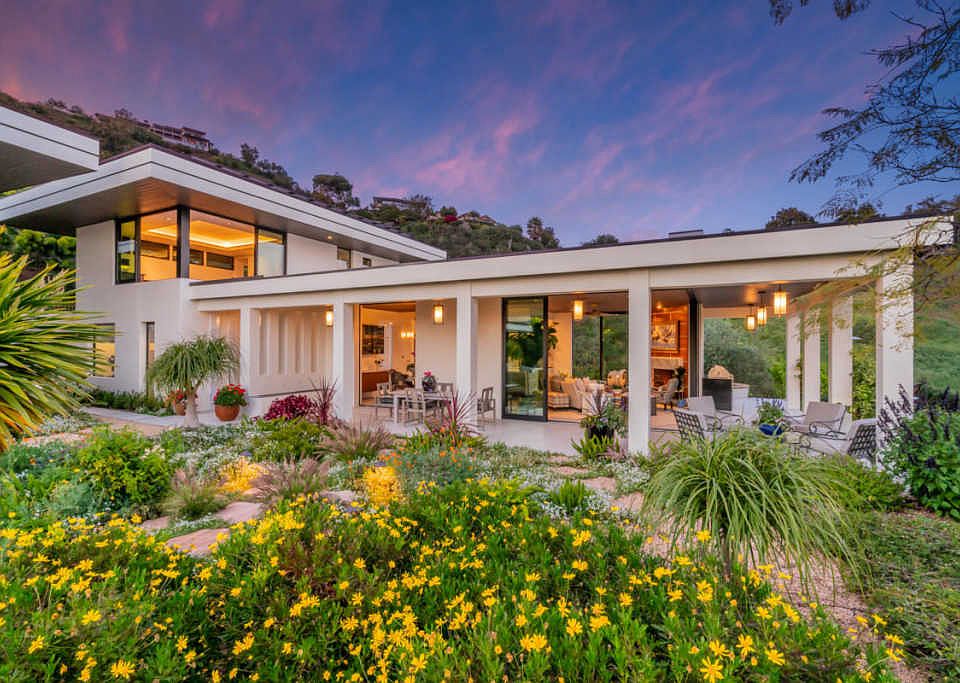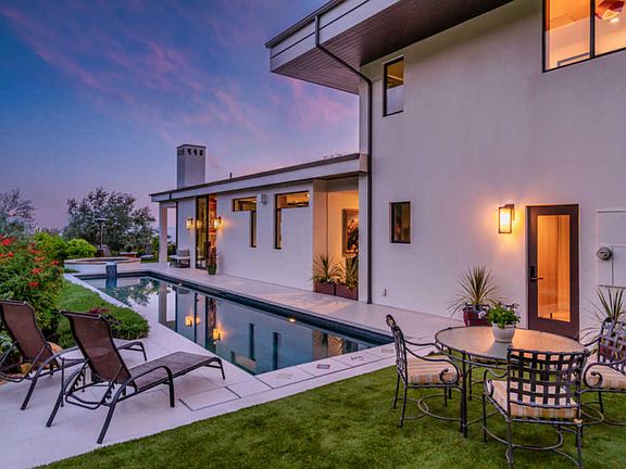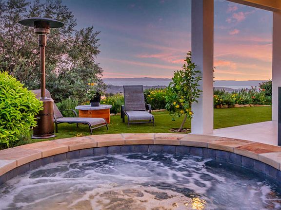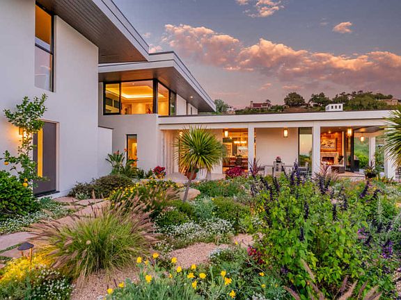 Built at the top of a private lane, this contemporary home offers solitude and elegance on an acre of breathtaking landscape. The 2 bedroom, 2 bath main home features a wrap-around lanai, seamlessly expanding the spacious living areas into the outdoors and gardens. The heart of the home, which includes a spectacular kitchen, dining and living room, opens to the patio with sliding glass walls, treating its owners to ocean breezes and Channel Island views. Custom marble, stone, tile and wood finishes add beauty and style. The serene lap pool and spa, as well as the entire home, are powered by a solar array. Above the oversized garage is a large guest apartment, complete with a wet bar, full bath, and a covered ocean-view terrace. This unique property is a must-see.