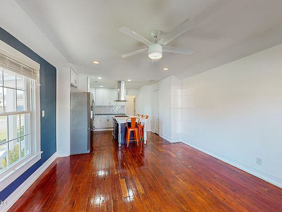 The open layout features original refinished hardwood floors and a gourmet kitchen with 5 burner conventional/convection gas stove, stainless steel appliances, tile backsplash, granite countertops, white cabinetry with 42'' upper cabinets and crown molding, pantry, and a 5' x 7' Quartz island. Perfect for entertaining!