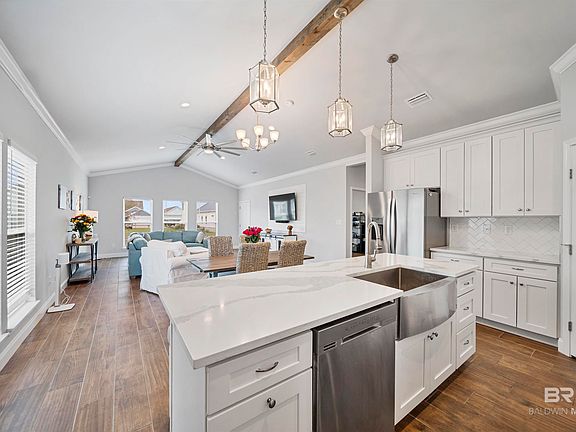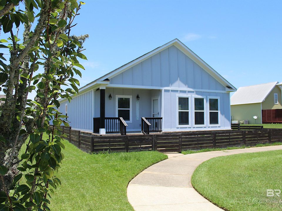 This storybook, Gold Fortified, exquisite cottage in the picturesque and desirable Cottages on the Greene is a must see! This inviting home sits at the end of a quiet cul de sac and has a beautiful open layout with a split floor design. The attention to detail is evident as you walk into this pristine, all tile home with a lovely ship lap wall leading you into a sun-filled alluring living space. The stunning bright kitchen is immaculate and has stainless appliances, gorgeous quartz countertops, a pantry and a spectacular island providing immense counter space and a breakfast bar. The kitchen flows into the dining area and great room with floor-to-ceiling windows reflecting abundant natural light, bringing the outside in. The beamed ceilings are breathtaking and add incredible character to this nearly new home, inviting you to stay awhile. The oversized primary bedroom is en suite and is a peaceful oasis unto itself. This room has space for a bed as well as a sitting area. A soaking tub and a large tiled shower accompany the double vanity and the two conveniently located walk-in closets in this spa-like bathroom. The two additional bedrooms are oversized as well and share a large tiled shower bathroom. This ideal cottage sits in an incredible community that gives Mayberry vibes. The community provides walking and biking trails, a southern community home with a full catering kitchen and party space as well as a huge fitness center and library along with a community pool and firepit. The picturesque community is centered on one of many ponds with a fountain and sitting areas. Perfectly located between the Beach Expressway and Highway 59, this gated community is minutes away from all conveniences and a straight, short journey to the white beaches of the Gulf of Mexico. Whether you are looking for a residence, a second home or an investment home, this is a timeless remarkable retreat you need to experience. Call today to make it yours! Buyer to verify all informat