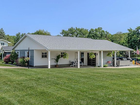 Luxurious 3 Bedroom, 2 Bath Channel-Front Home on Stunning Lake Wawasee! *Indulge in exceptional channel front living, just a short boat ride to the lake, with this beautifully renovated home boasting 120’ of channel frontage on Indiana’s largest natural lake. Every inch of this 3-BR, 2-bath property has been thoughtfully curated with premium materials and upscale finishes. The designer kitchen showcases granite countertops, a custom backsplash, new cabinetry throughout, and elegant lighting and plumbing fixtures updates. *Inside, sophistication meets comfort with warm wood-and-brick accents framing the fireplace, rich new flooring, and plantation shutters throughout the home. All bedrooms feature stylish furnishings, custom drapery, and cohesive lake-inspired décor, creating a serene retreat in every space. *The spa-like bathrooms impress with custom tile showers with inset shelving, granite countertops, and matching cabinetry. The laundry area includes a nearly new washer and dryer, rounding out the home’s practical yet polished design. *Step outdoors to your own lakeside sanctuary. A 120’ waterfront footprint includes a newly updated 60’ dock section with multiple boat slips(5-7), a covered pontoon area, and an outdoor shower for effortless lake-day clean-up. Entertain in style at the complete outdoor kitchen—featuring custom cabinetry, durable metal countertops, a handwashing station, and a feature wall behind the TV area. Gather around the firepit or relax in premium Adirondack-style chairs and poly tables—built for both comfort and year-round enjoyment. *Additional upgrades include a new roof with extended coverage over the outdoor entertaining space, premium new siding on the home and shed, newly installed entry doors, and clean concrete borders framing the landscaped yard. For enhanced aesthetics and function, the home’s electrical service has been upgraded to 200 AMP with the main service line now professionally buried. An extraordinary opportunity to own a fully updated, high-end home on Lake Wawasee—schedule your private showing today and enjoy the finest in waterfront living. *Brokers see agent remarks for extra amenities available*