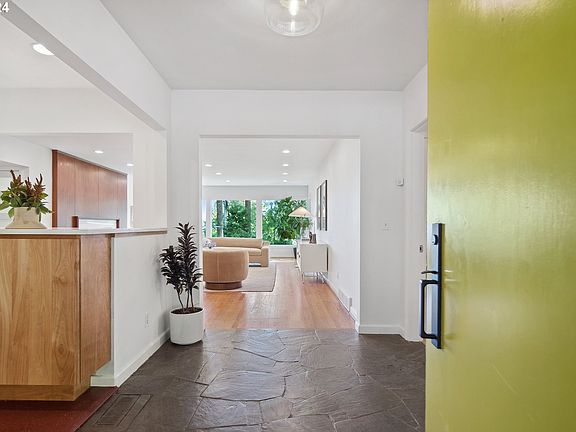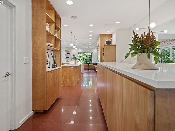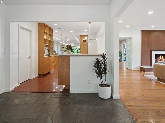 Welcome to a mid-century Dunthorpe gem designed by renowned Portland architect Roscoe Hemenway. This 1958 daylight basement ranch is situated on nearly an acre with oversized picture windows and stunning valley views, and has undergone a complete renovation that perfectly complements its sleek design. Main floor living spaces were revitalized by esteemed Portland Interior Design Firm Bright Designlab, incorporating unique design details and fixtures from Cedar and Moss, Rejuvenation, Schoolhouse Electric, Jonathan Adler, Herman Miller, and more. The kitchen is a culinary enthusiast's delight, boasting maple hardwood cabinets, pristine white quartz countertops, a nearly new Sub-Zero fridge, a Blue-Star six-burner range, a new Bosch dishwasher, a second Miele dishwasher, Viking wall oven, warming drawer, and a charming breakfast nook with built-in bench seating and floating shelves. Additionally, there is an extensive walk-in pantry for organizing kitchen essentials. Just off the kitchen, the dining room looks onto a cozy covered outdoor space with a wood-burning fireplace and stunning views of trees, hills, and valleys just beyond the Willamette. The family room's centerpiece is the magnificent gas fireplace with mahogany and quartz surround. The light, bright primary suite with a walk-in closet and remodeled bathroom, two additional bedrooms, laundry closet, and 1.5 additional bathrooms round out the main level living. The lower level of the home boasts three generously sized bedrooms, ideal for home offices or multi-generational living, two additional remodeled full bathrooms, wine cellar, gym with Finlandia sauna, a media room, additional laundry room and ample storage. Don’t miss the expansive bonus space with a fireplace under the three-car garage or the built-in storage garage. The lush garden features raised beds, expansive lawn, walk-out trampoline, basketball zone, perennial beds, chicken coop & tranquil tree canopy. Walk to Riverdale Grade School.
