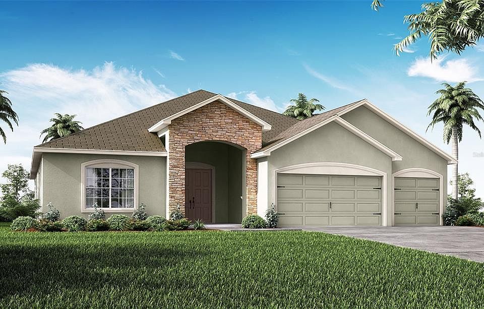 Under Construction. New construction home with 2536 square feet on one-story including 5 bedrooms, 3 baths, and an open living area. Enjoy an open kitchen with white shaker-style cabinets, Samsung stainless steel appliances, a walk-in pantry, and a spacious breakfast bar, fully open to the dining café and gathering room. The kitchen, living area, laundry room, and baths include luxury wood vinyl plank flooring, with stain-resistant carpet in the bedrooms. Your owner's suite is complete with a walk-in wardrobe and a private en-suite bath with dual vanities, a tiled shower, garden tub and a closeted toilet. Plus, enjoy a covered lanai, 3-car garage. Custom-fit window blinds, architectural shingles, energy-efficient insulation and windows, and a full builder warranty. “Please note, virtual tour/photos showcases the home layout; colors and design options in actual home for sale may differ. Furnishings and décor do not convey.