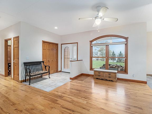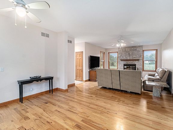 This spacious walkout ranch with views of Pine Lake #4 is a treat to see. The main floor boasts 1954 sq. ft of living space. It includes a large master suite with double vanity, jetted tub encased with decorative tiling, private toilet and shower room, and a walk-in closet. The main floor has two additional bedrooms and 2nd full bathroom. Solid oak hardwood flooring in the living areas, master bedroom, and one of the additional bedrooms. The 2nd additional bedroom has new carpet and a walk-in closet. Tile flooring in the kitchen, dining area, entrance way, and bathrooms. The large living room has a cozy wood-burning fireplace framed by stone tile from floor to ceiling. The large kitchen has oak cabinetry, a pantry, plenty of counter space with seating at the bar and an eat in kitchen area.