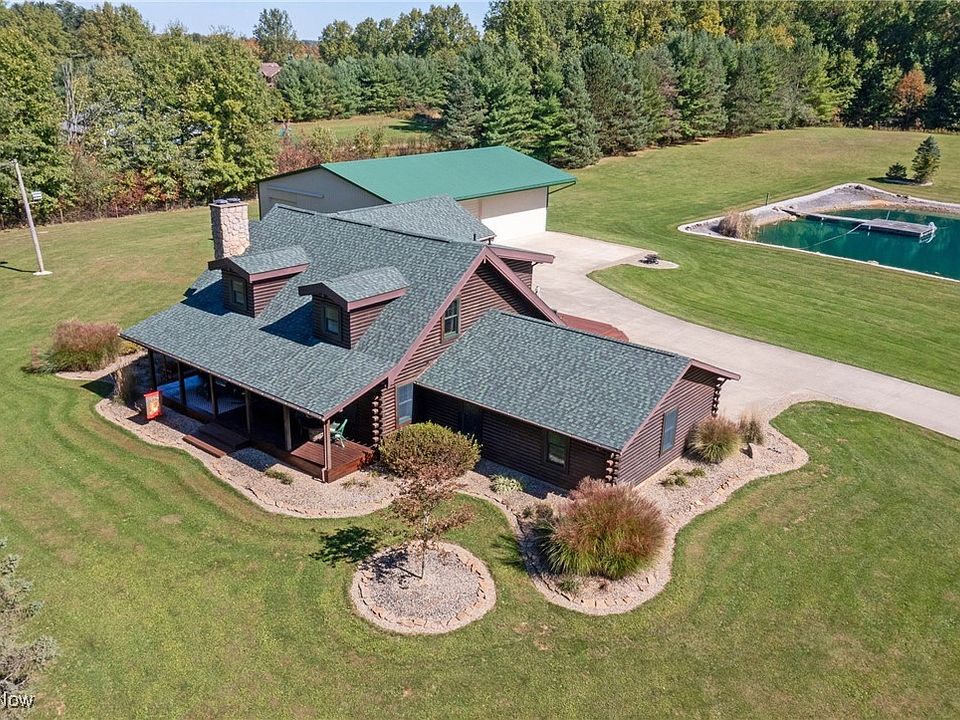 Discover your private oasis on 7.5 stunning acres! This property features a beautiful lined pond with a dock, ideal for fishing and swimming. An impressive 60 x 40 outbuilding boasts multiple oversized 12' doors, a concrete floor, separate power and water, a loft, and a finished office/garage equipped with a propane heater and epoxy flooring. The exquisite log home showcases gleaming hardwood floors, soaring ceilings, open floor plan and architectural details. Dream kitchen with large island and commercial refrigerator! Enjoy a spacious loft with a second living area and private balcony overlooking the pond. Choose between two generous primary suites with attached bathrooms. With main floor laundry and a finished basement featuring two rec rooms, an office, and ample storage, this home is perfect for your lifestyle. Located in the desirable Ontario School District!