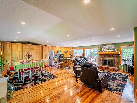 Welcome to this spectacularly updated home with an inviting open floorplan that is sure to impress. As you step inside, you'll immediately notice the warmth of the hickory floors that add both charm and elegance to the living space. The kitchen boasts exquisite Schroll cabinets, offering ample storage and a touch of luxury. Cozy up and unwind in not one but two gas fireplaces, creating a cozy ambiance during chilly evenings. And if you enjoy working on projects or simply need a comfortable space for your vehicles, you'll appreciate the convenience of a garage equipped with a heater. The master bedroom is a private sanctuary, featuring its very own deck where you can enjoy peaceful mornings with a cup of coffee or unwind in the evening under the stars. Relax in the bar that opens up to the park-like backyard, and you'll be met with an outdoor landscaped oasis. It is a haven for entertainment, boasting two decks and a patio that provide the perfect setting for gatherings, barbecues, and memorable moments with family and friends. Let's talk about impressive efficiency features fully paid-for Skyline solar panels, programmable thermostats, ceiling fans, and critter guards for panel protection. These elements ensure energy conservation, reduced carbon footprint, and a comfortable, eco-friendly living space. Don't miss the chance to experience this captivating property for yourself!