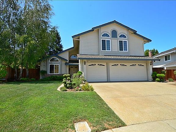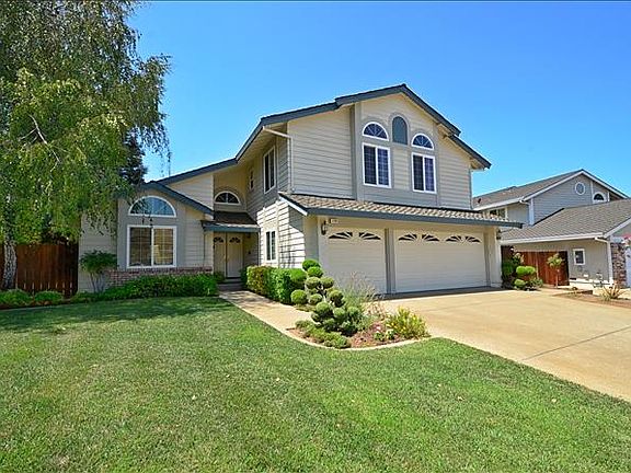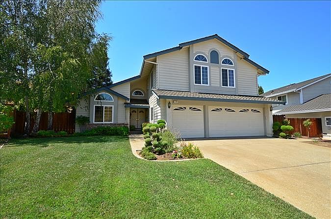 Don't roll the dice-- guarantee that you play a triumphant hand with this gorgeous Pleasanton hills two-story that seamlessly merges the luxury of a Boardwalk hotel with the natural beauty and tranquility of a mountain resort. High in the hilltops, looking down upon world-famed Tri-Valley Wine Country, with the whisper of redwoods and the panorama of the soft grasses of the adjacent open space that goes on for miles, this home's setting trumps any location on the board. This lovely residence's completely remodeled 2,434 square foot interior, which includes a granite chef's kitchen, formal living room with marble fireplace, spa-like master bathroom with Jacuzzi, and four sunny bedrooms, will make you the undisputed winner of life's game of Monopoly. With everything in such close proximity, you won't even need to pass Go when you walk to this prestigious neighborhood's many amenities. Beautiful Vintage Hills Park is only a block away, and Vintage Hills Elementary School, part of the nationally acclaimed Pleasanton school district, is within easy walking distance. Historic downtown, with its tempting restaurants and specialty shops, is only minutes away and wine country beckons with dozens of vineyards offering tantalizing tastings and manicured picnic grounds. A nearby community pool provides a place for neighborhood residents to cool off and gather together under the shade of the poolside cabana or perhaps discuss the contents of the Community Chest. And when it's time to dry off and go to work, commuters will be delighted by the easy access to highways and public transit, including BART and rail, though B. & O. Railroad might still be a little far away to utilize on a daily basis. Sequestered at the very end of this quiet cul de sac, this home is consummately private, its arched windows peering delicately over the wide driveway and green front lawn. The towering redwoods, open blue sky, and the hush in the air all belie how convenient this location is to all the comforts of civilization, feeling more like a far-away retreat than a suburban East Bay community. The entranceway sets the tone, immediately rewarding all the senses with soft light from the second story arched window and fanned cut glass inserts on the double front doors, coupled with the refreshing feel of cool twelve-inch tile floors on bare feet. The vaulted wood beamed ceiling and glass chandelier draw one's gaze upwards, past the glossy oak banister of the carpeted staircase which ascends to the solace of the four bedrooms. The formal living room and dining room compete for guests' attention, luring them with the glow of warm firelight from the sumptuous yet understated marble wood-burning fireplace and hearth which is built into a surrounding cream-colored wooden mantelpiece with classical lines. Making an equal impression are the giant picture windows, two in the living room and one in the dining room, the front-facing one topped by an arched window which extends nearly to the soaring vaulted ceilings. Plush carpets pamper toes here and in all four bedrooms, while the home's other standard features shine through, including custom draperies and blinds, three-inch baseboards, and energy-efficient dual pane windows which will be the disappointment of the Electric Company. The dining room is genteel enough that you might occasionally be tempted to break out your top hat for dinnertime. Seating eight with room for a hutch, it boasts a lovely chandelier and easy access to the kitchen through a pocket door. Meal preparation is a joy with the lovingly remodeled gourmet eat-in kitchen flecked with sunlight reflected by the granite surfaces and exquisite Brazilian hardwood floors. A large granite-topped island packed with cabinets and drawers with room to pull up four barstools is the centerpiece, surrounded by slab granite countertops with a designer tile backsplash with accent strip and highlighted by recessed can lighting. An arsenal of modern appliances includes a d