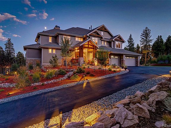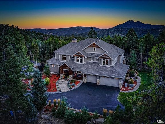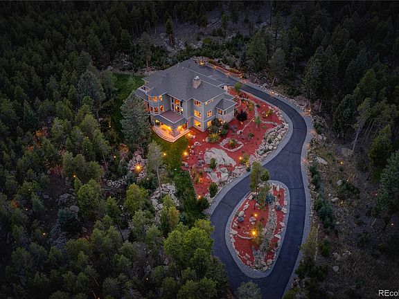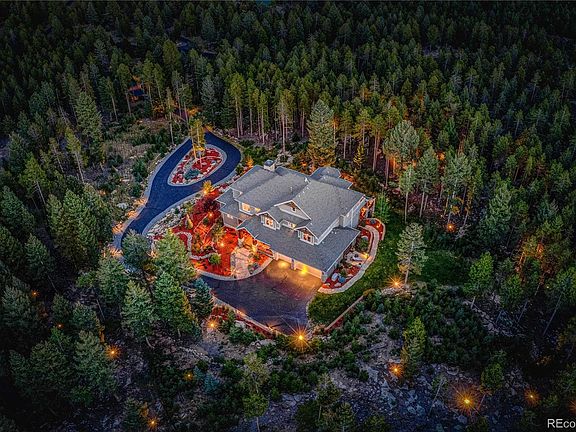 Traditional mountain estate exudes timeless elegance & classic beauty. Located in the exclusive Belle Meade executive community, this pristine sanctuary sits on 10+ acres w/ extensive resort style landscaping & lighting. Enjoy private mountain living close to 285, convenient amenities & 30 miles to Denver. Thoughtfully designed, beautifully appointed & meticulously maintained. Open concept home has ample windows to showcase the amazing forest views. Ideal layout for hosting intimate gatherings or larger events. Heated, covered front patio welcomes you. The living room w/ 2 story vaulted ceilings, stacked stone gas fireplace & dark wood finishes has convenient bar area & flows seemly into dining room, kitchen, breakfast nook & heated deck. The chef's kitchen offers HUGE curved island, gourmet appliances, dark wood cabinets, granite counters & butler's pantry w/ refrigerator. The main floor has en suite bedroom, office/bedroom & powder room. The upstairs primary suite offers stunning views, sitting area & private patio. The spa-like primary en suite bath features jetted tub & dual shower towers. The spacious walk-in closet is attached for ultimate convenience. The upper level has 2 bedrooms w/ adjoining shared bath, laundry room & guest en suite bedroom. The walk-out basement showcases a stunning all-season room to bring the forest inside to enjoy all year w/ walls of windows, seamless sliding glass doors, wood ceiling, heaters & stacked stone gas fireplace. The lower level offers great room w/ pool table, bar, wine cellar, media/flex room, laundry room, powder room & en suite bonus room for gym, office or bedroom (no closet). Great layout for multi-generational living. Generator, irrigation & A/C in primary bed & bath. Low maintenance home on well-mitigated property. Room for your mountain toys w/ oversized 3 car garage. Belle Meade lots are 10+ acres & allow 3 horses or llamas. Road maintenance & snow plowing by association. Top ranked High School. Welcome Home!