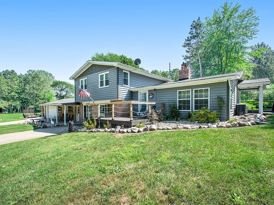 Corey Lake Access Incredible opportunity to own this pleasantly updated 3 bed, 3 full bath home that offers over 1 acre of property(6 lots and 40' shared beach with a dock for access to All Sports Corey Lake The lower level provides a bar area and nice sized living/family/rec room and a full bath. The main level provides soaring ceilings, large family room that is open to the kitchen and dinning area with a gorgeous 3 sided fireplace The upper level boasts 3 large bedrooms, a shared bath, and the master suite with a private bath. 2 car garage, 32*14 Storage shed. Too many updates to lists. Enjoy Lake Living on one of the premier lakes in SW Michigan