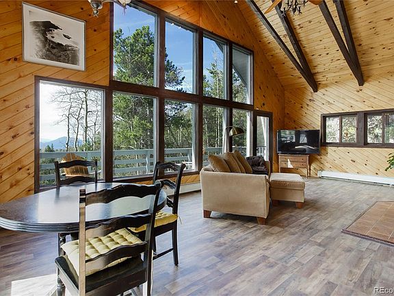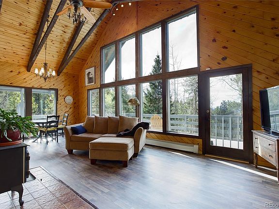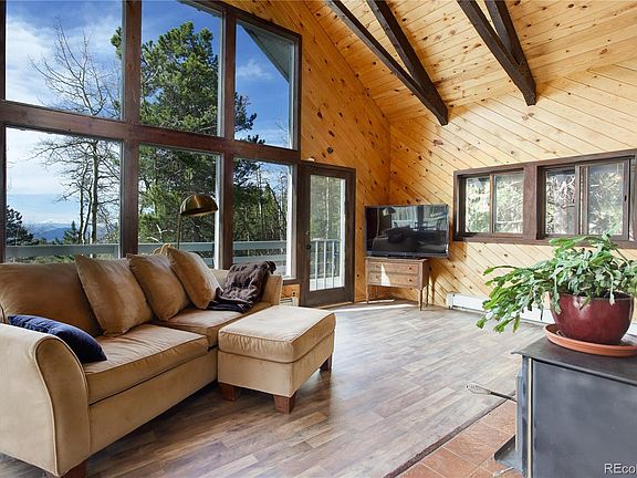 This peaceful 2.1-acre lot on Conifer Mountain is tucked back off the road with lots of privacy and is covered with a healthy Aspen grove and beautiful mix of conifer trees. The 2,181 SF mountain contemporary home has an open floor plan with tongue and groove vaulted ceilings and a wall of south-facing windows that bring the Pikes Peak and Long Scraggy Peak views into the main living area. The living room, kitchen, dining room, 2 bedrooms, full bathroom and laundry are all on the main level. The master suite includes a ¾ bathroom and walk-in closet and is privately located on the upper level by itself. The basement encompasses a ¾ bathroom, bedroom, family room and garage access. The 1-car garage is over-sized long with plenty of room for a workshop. The 1-car carport is currently being used as a sandblasting studio and can easily be converted back to a parking bay. The wraparound Trex deck maximizes the outdoor living area and provides lots of space to entertain or relax with amazing mountain views in the distance and the sound of Quaking Aspen in the warm months. There is quite a bit of flat area near the house. The well allows for watering of domestic animals and poultry as well as up to 1 acre of home gardens and lawns. There is a seasonal creek that runs through the property during the rainy season. Lots of updates and tons of storage. Easy commute to Conifer amenities. Tons of outdoor fun close by. (Interior pictures were taken the morning of 6/2 and will be uploaded when received from photographer.)