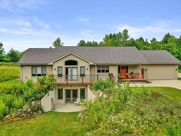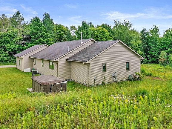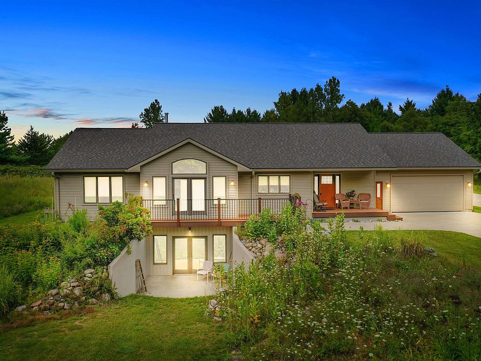 Nestled within a tranquil setting, this remarkable home boasts a wealth of distinctive features that cater to both comfort and style. The heart of the home, the living room, offers a cozy haven with a gas fireplace adorned by a walnut hearth & tile surround. The living & dining room floors are exquisite maple wood flooring sourced trees in Chelsea, MI. The kitchen stands as a testament to both functionality & beauty, featuring custom VanPolen hickory cabinetry, Cambrian Quartz countertops & a suite of premium appliances including a Viking double oven & Viking gas stove top range. A removable island enhances the kitchen's versatility. Crafted with careful attention, the details abound throughout the home. Vaulted ceilings create an open & airy ambiance, while oak trim & solid doors underscore the quality craftsmanship of this Bob Hemis custom build. A walk-in pantry, which could easily be transformed into a second bedroom closet, offers convenient storage solutions. An inviting small balcony extends from the dining room, providing a charming outdoor space. The attention to detail extends to the lower level, where a full basement awaits exploration. Boasting 10' ceilings, stained concrete floors, & knotty pine accent walls, this space offers boundless possibilities. A workshop, kitchenette with Corian countertop, & a 3/4 bathroom enhance the basement's functionality. A non-conforming bedroom with a walk-in closet adds extra accommodation options. Built in 2013, the home embodies contemporary design and thoughtful planning. Low maintenance is a recurring theme, from the maintenance-free decking to the steel siding that has no seams. Practical extra amenities enhance the home's appeal, including an attached finished garage with water & 10' ceilings, covered front porch, whole house Generac generator provides peace of mind, 220 v hot tub hookup & Central air for added comfort, wiring for solar heat, gutters and a 30'x70' barn equipped with 12' & 10' doors & electric