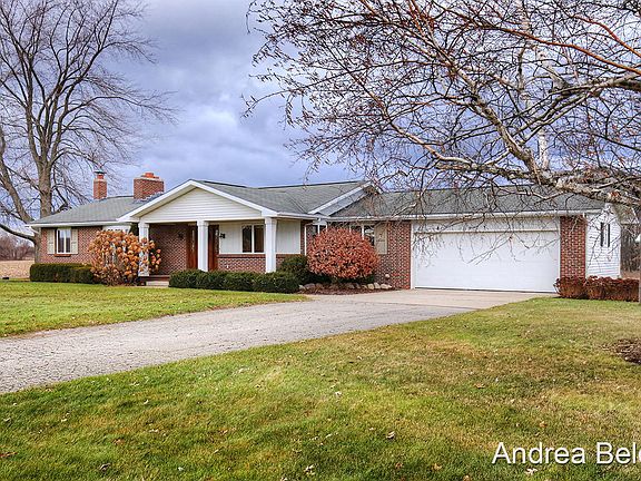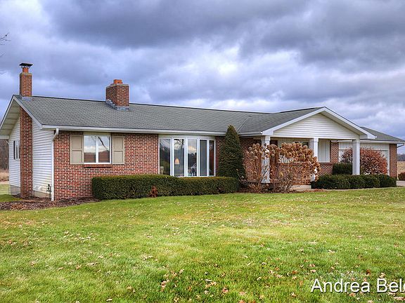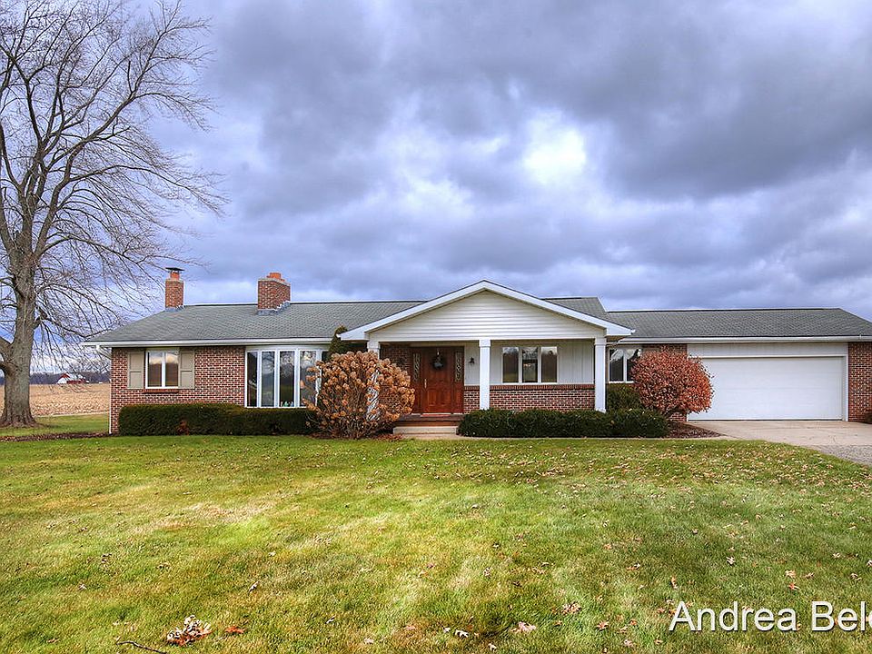 Custom built 4 bedroom/ 3.5 bath Ranch situated on 3.67 beautiful acres! Prime location for hunting enthusiasts, farming, or horses. But only a quick commute to US 131. Immaculate lawn, complete withunderground sprinkling. Inviting entryway, sunken living room with cathedral ceiling, bow windows & beautiful stone fireplace. Main floor laundry.Kitchen features tile back splash, quartz surface & eating area. French sliders to deck. 2 bedroomson main floor & 2 bedrooms on Lower Level. Finished basement with family/Rec room. New updates in the past 5 years, new front porch, new front door, & front brick. New well just put in 4 yrs ago. Hot water heat -with 4 zones for comfort & central air. 32x48 Morton building & two stall attached garage complete this perfectly maintained home!