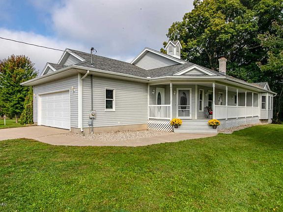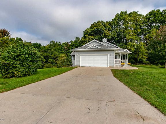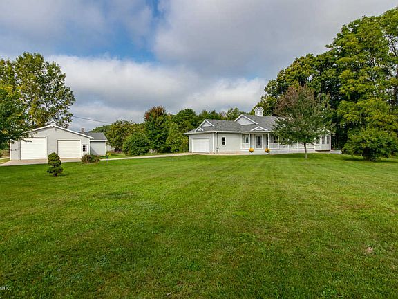 One of a kind 4 bedroom 4 bath custom walkout ranch on a beautiful 2 acre rural setting. Unbelievable garage/workshop space of 3200 sf in addition to attached 2 stall garage. Home has gorgeous hardwood floors, real fieldstone fireplace, new carpet and huge 4 season room. Cathedral ceilings and open floorplan. Finished walkout basement with kitchenette. Enjoy relaxing sunrises from the huge porch or take in sunsets from the 4 season room, private views in all directions. Garage is fully outfittedwith half bath, office space, loading dock, oversized ceilings; 9 ft and 10 ft garage doors to accommodate RV's. There are two furnaces, great for a workshop, art or craft gallery, 5 minutes to 131! Lot to be split at closing, dimensions to be determined, 2 acres +/-. Tested negative for PFAS.