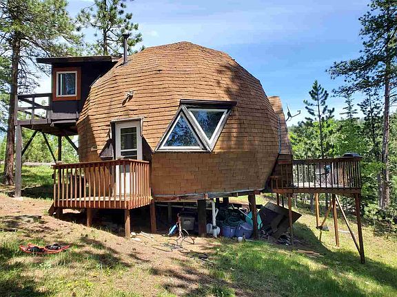 Little cabin in the woods. This geodesic dome cabin was built in 1979. 692 sq ft. 1 bd/1 ba. Open deck off living room and another off the upstairs bedroom. Hearthstone wood burning stove in living room heats the entire cabin. 3.2 acres on two lots in Englewood Acres off Englewood Road. Close to Forest Service lands. Private lot with views of the Black Hills. Mickelson Trail follows the eastern border of this acreage. Private well. Contained septic tank. This cabin will not qualify for financing and it will need to be sold for CASH only. $174,900 is the CASH price.