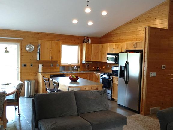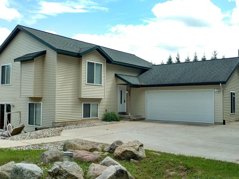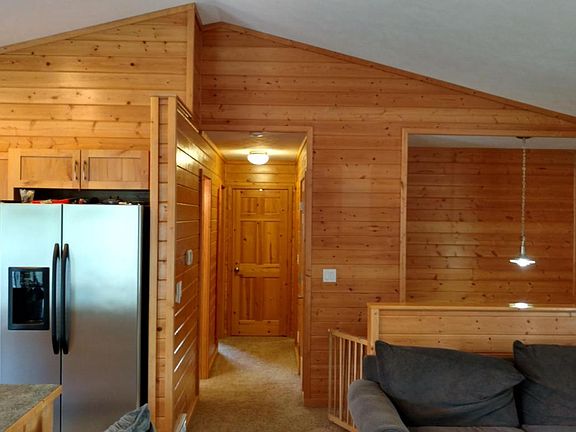 This is a beautiful, knotty pined finished home secluded on a 1.5-acre lot surrounded by trees. The main floor is open from living area to kitchen with access to the large deck (approximately 10' x 20') overlooking the private back yard. The kitchen, master bedroom, and main floor bathroom all boast tiled flooring. There is plenty of space as you venture downstairs where you'll again take in the knotty pine finishing. Two living/recreational areas provide space and flexibility to your living arrangements. There is a full bath, bedroom, and bonus room (currently used as a salon) on the lower level that also contains walkout access. From the walkout there is a nicely finished walkway giving you access to the front of the house. At the front of the house you'll notice the oversized