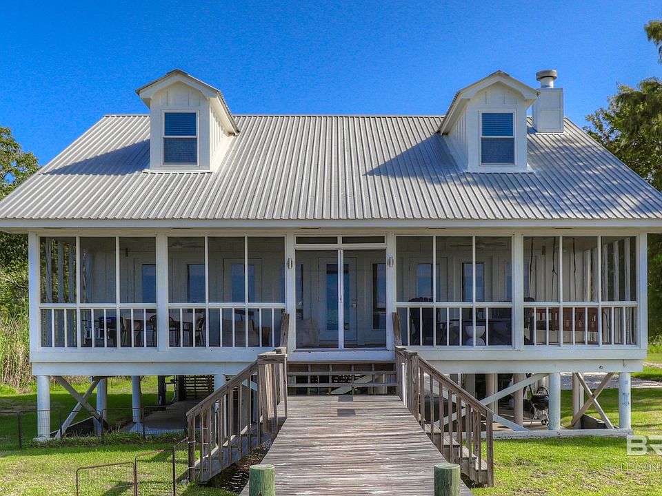 This bay house is a MONEY MAKER! It has a solid history of weekly and nightly rentals—just ask the listing agent. It’s fully furnished, including linens and cookware! You can use it year-round, part-time, or as a rental. The property has 100 feet of Mobile Bay frontage and has been updated recently. The HVAC system and appliances were replaced in 2023, along with a new washer and dryer. The main bathroom was remodeled in October 2022 with a new shower. The back screened porch features new flooring, ceiling fans, and updated French doors. Other recent improvements include a new driveway and fresh paint on the seawall. Inside, you’ll find an open floor plan with a wood-burning fireplace, vaulted ceilings, and beautiful pine floors. The primary bedroom has lovely bay views, and there's a second bedroom and bath on the main level for added convenience. Upstairs, there’s a spacious area for guests with a large bathroom. 2 like new Wave Runners and Trailer are not part of home sale but can be bought for $45,000. Come make this your retreat! Buyer to verify all information during due diligence.