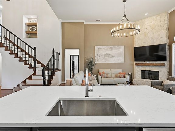 Sparkling poolAustin stone fireplaceBackyard oasisBeautiful wood flooringHuge covered patioFormal dining roomStainless steel appliances