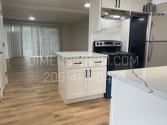 Stylish shaker cabinetsAll-electric kitchenNew kitchen cabinetsHardwood floorsVertical blindsSpacious one-bedroom one-bathroom layoutStainless steel appliances