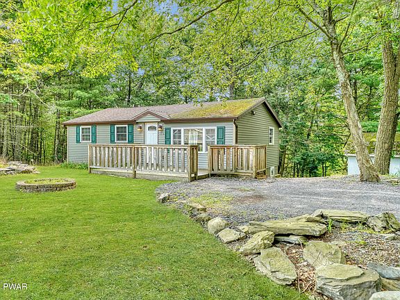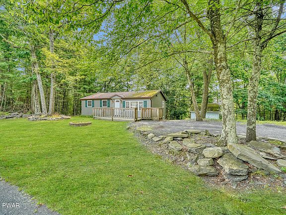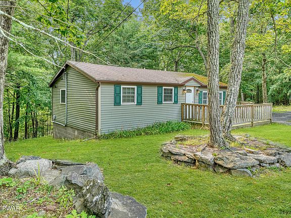 READY TO GO RANCH WITH GRANITE KITCHEN, HIGH CEILINGS, FRONT PORCH, & BACK DECK! Located in a gated Pocono community w/many lakes, beaches, an outdoor pool, & nature about, find this 2 bedroom, 1 bath TURN-KEY ranch. A flat yard offers plenty of space for outdoor fun with family & friends! Sip some lemonade on the front porch or barbecue out back on your large deck w/ beautiful views!!! Inside an open floor plan makes the space feel so much larger! Granite kitchen with stainless steel appliances, white cabinets, & plenty of work space! Living room w/cathedral ceilings and propane fireplace. Two large bedrooms & full bathroom. Outside entrance to full basement! LOW TAXES! MODERN FINISHES! ONE STORY LIVING! TAKE THE 3D VIRTUAL TOUR AND SCHEDULE YOUR SHOWING TODAY!
