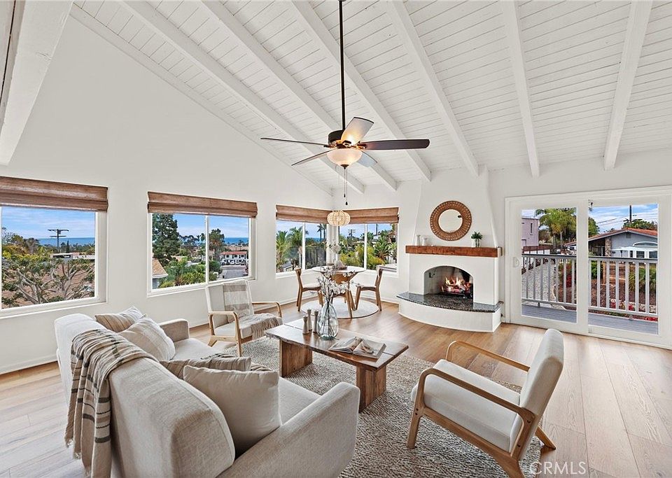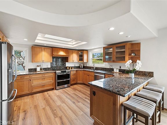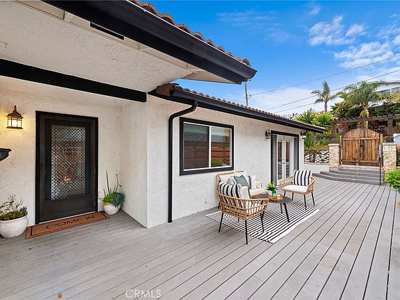Beautiful coastal retreat offering stunning ocean and Catalina Island views! Gracefully perched atop a 7,480 sq ft corner lot on a quaint cul-de-sac street, taking full advantage of the majestic surroundings with multiple balconies, expansive decks, and windows to enjoy the ocean, Catalina Island, sunsets, and city lights views. This 4 bedroom, 3 bath residence lives like a single level home with 3 bedrooms and 2 bathrooms on the main level and on the lower level is an expansive 4th bedroom that could be used as an in-law quarters/guest quarters, converted ADU, etc., with a separate entrance and an auxiliary kitchen. Offering endless possibilities to make it fit your needs, this lower-level space could also be used as a family room, game room, bonus room, and more. The main level features vaulted beamed ceilings creating a refreshing atmosphere, while the seamless open floor plan connects the spacious living, dining, and kitchen areas, allowing for effortless entertaining and easy living. Natural light and sweeping ocean views abound! Designed with functionality in mind, the large kitchen impresses with granite counters, stainless steel appliances, and an ocean view to enjoy while preparing meals. The primary bedroom is a haven of tranquility featuring a private balcony to soak in the ocean views and an exquisitely updated primary bathroom enhanced with beautiful design elements. On the exterior, a gorgeous garden oasis surrounds the home and offers sustainable living with multiple producing fruit trees. Recent improvements throughout completed since 2022 include solar panels installed and seller owned, a new furnace, new AC, new luxury plank flooring, an upgraded electrical box, new carpet in the bedrooms, new heater in the hot tub, new ceilings fans in the bedrooms, a new microwave, new water heater, drip system for the fruit trees, new landscape lighting, new fridge and dishwasher, quality new black light window shades in the bedrooms, built-ins in closets, and a gas line on the patio for a BBQ . Whether you are looking for a peaceful escape or a stunning backdrop, this home has it all! Great location close to shopping, dining, easy freeway access, and the beach!