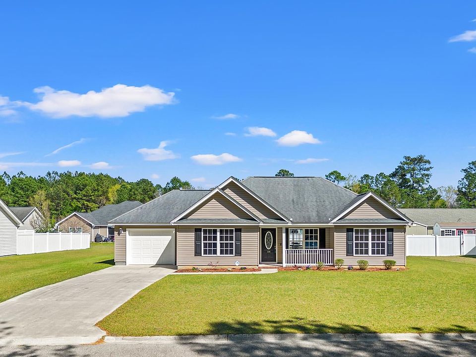 Discover spacious living in this newly painted home, featuring a vaulted ceiling in the living room and a cozy ceiling fan for added comfort. The kitchen is designed for convenience, offering ample cabinet space, a pantry, and a breakfast bar ideal for casual dining. The primary bedroom is a perfect retreat with its tray ceiling, ceiling fan, and a large walk-in closet to accommodate all your storage needs. The ensuite bathroom features a whirlpool tub and a separate shower. Enjoy the convenience of a spacious 1-car garage with easy access to the mudroom/laundry room. Located in Hampton Place, this home offers easy access to shopping, grocery stores, healthcare facilities, restaurants, and Conway’s historic Riverwalk. Plus, it's just 19.6 miles from the ocean. This move-in ready home is a true gem, seamlessly blending comfort, convenience, and community living. The seller is offering a one-year home warranty! Don't miss out on the opportunity to make this home yours – schedule your viewing today!
