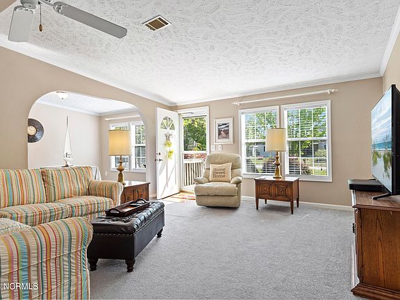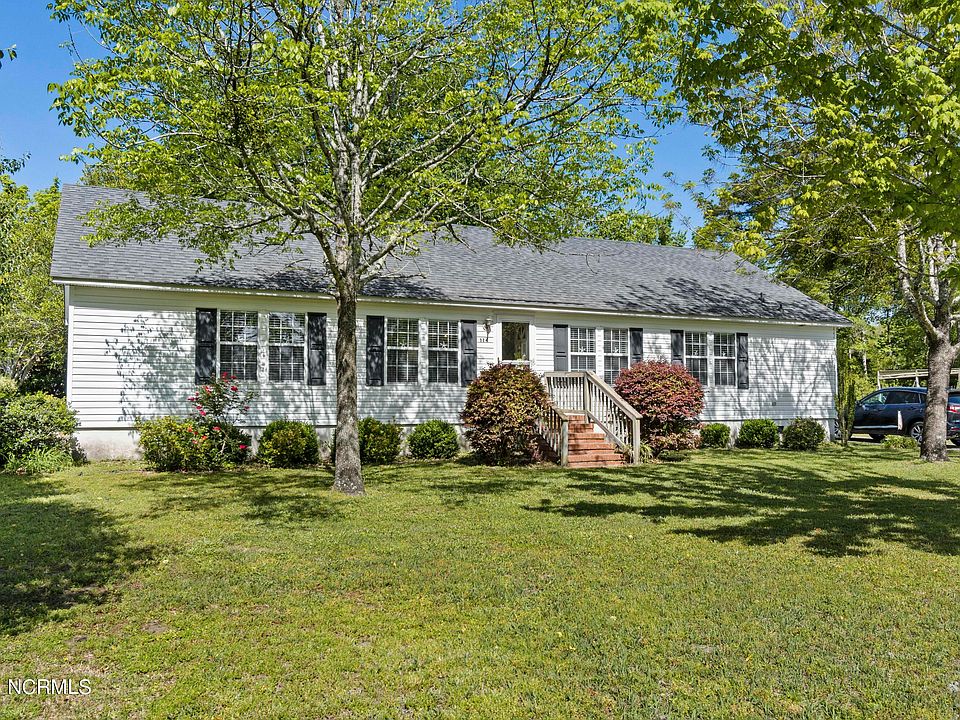 $20,000 price reduction. Lovely coastal home in popular Bayshore Park community with boat ramp ($300 a year). Spacious and open with natural light. Lots of outdoor space with large screened porch on the back of the house and an open deck off the screened porch. Just a few blocks from the ICW. Split plan with primary bedroom at one end of the house and two additional bedrooms at the other end for privacy. Each bedroom has a walk in closet. Spacious eat in kitchen with a pantry. Open living area. Gas fireplace in living area is not used. Separate dining room. Large lot with a separate storage building and metal carport. Bayshore Park (no HOA dues) offers neighborhood boat ramp for $300 yearly fee. Boat channel to ICW has been dredged. Cape Carteret also offers boat ramp for a fee for residents. Town Pier and picnic area in neighborhood. Golf cart friendly community. Located in award winning school district. Call for a showing today! Icemaker has not been hooked up. House is being sold as is. Construction type-modular.