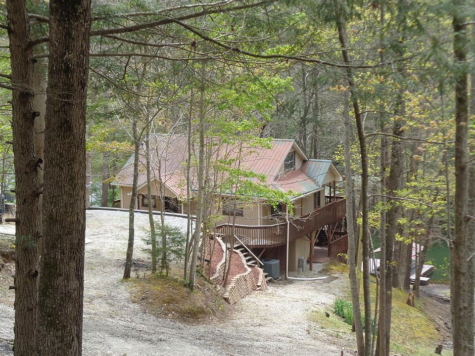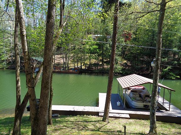 Nice Vacation lake front cabin on Wood Creek Lake. This one is nestled in the woods with a nice private dock.Lots of memories waiting to be made in this one. Home can have up to 4 bedrooms if needed and 2 1/2 baths. This 1.5 story retreat has a walk-out basement and front wrap around porch and double back porches. Main level has foyer, living room/dining combination, Kitchen with appliances and bedroom and full bath. Upstairs has 2 bedrooms with a shared 1/2 bath & shared closet. Lower level has 4th bedroom or family room laundry room and full bath with tub shower. This one has a partial concreted driveway, and another driveway that goes to the lake, firepit area, nice dock. Be on the lake right now!