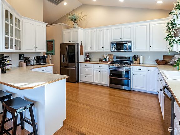 This home has it all & checks all the boxes! Great one level, wonderful curb appeal & private cul-de-sac location! Inviting open design featuring main living room built in gas fireplace, vaulted ceilings, open to dining & spacious kitchen offering ample counter & cabinet space, eating bar, double oven, SS appliances, primary suite w/private ba, walk-in closet, utility room w/sink & cabinet, A/C. Expansive outdoor living that boasts afternoon sun, covered patio w/heater & smokeless Breeo fire pit, winding pathways, multiple sitting & entertaining areas, built in hot tub w/privacy screen, sprinkler system, drip line to plants, shed, raised garden beds. Centrally located close to parks, walking trails, just minutes to downtown historic Lynden.