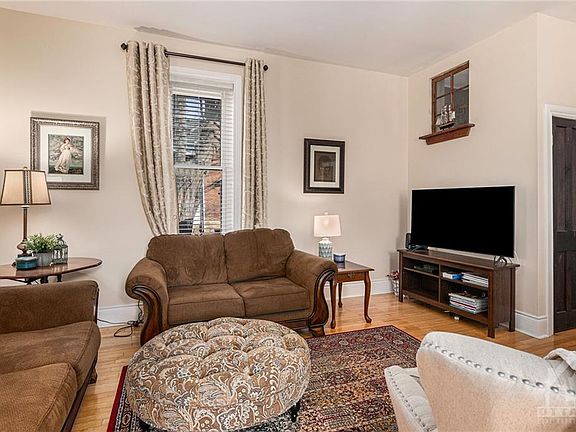 Desirable century brick home on large lot with backyard retreat. Added bonus is heated detached garage fully insulated and drywalled in 2020 - currently used as a gym with hydro, laminate floor and side door. Updated family home full of tradition and charm including high ceilings, wide baseboards and hardwood floors. Full verandah leads to impressive foyer with closet. Large open living and dining rooms. Sunny kitchen offers island, pantry and delightful breakfast nook with desk station and patio doors overlooking yard. Main floor powder room with window. Side entry-mudroom has deep storage closet. Sweeping curved staircase to sitting room/office, three bedrooms and most convenient laundry station. Primary bedroom has big closet plus direct access to 4-pc bathroom. All-fenced lovely landscaped backyard features deck, patio and 2021 storage shed. Upgrades include 2021 asphalt shingles, 2021 hot water tank & 2021 refurbished gas furnace. Walk to downtown, parks and trails. 20mins Kanata.