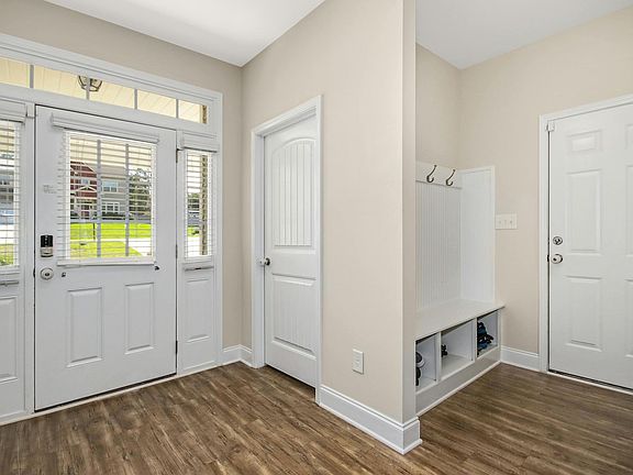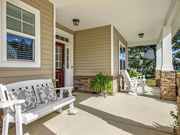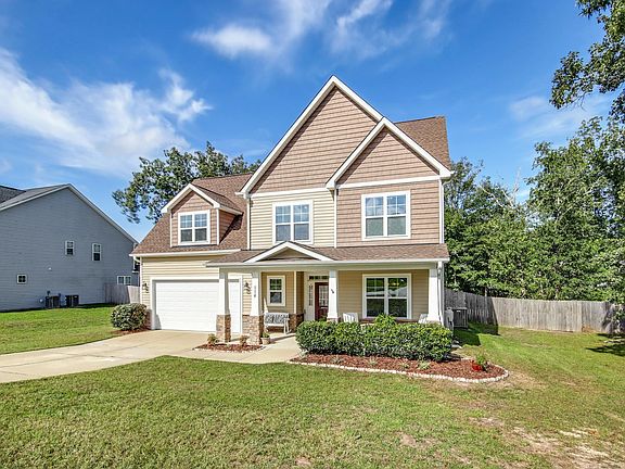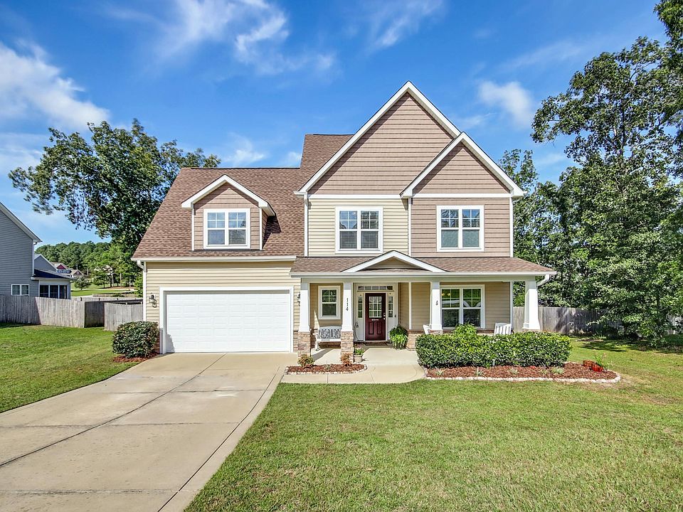 Welcome to your dream home in the coveted Oakmont community, a gated neighborhood offering the perfect blend of tranquility and convenience to Raleigh and Fort Liberty. This spacious 4-bedroom, 3-bath home features your personal backyard oasis. Enjoy sunny days by the inground pool, featuring a tranquil waterfall, or entertain guests on the covered and extended patios. The fenced backyard ensures privacy and security. The first floor features a versatile bedroom with full bath. Engineered hardwood floors flow seamlessly throughout the main level. Kitchen has a pantry, granite countertops, backsplash, a gas stove, and stainless steel appliances, including the refrigerator. The 2nd floor features 3 bedrooms and bonus room. The primary suite has an en-suite bath complete with double vanities, a glass-enclosed shower, a garden tub, and a walk-in closet. Two additional large bedrooms offer plenty of space, complemented by a hall bath. The second floor also features a sizable utility room and a massive bonus room, perfect for a home theater, game room, or additional living area. 12x16 storage building offers additional space for all your tools and outdoor gear. The community amenities include a pool, clubhouse, gym, and playground. A charming rocking chair front porch adds to the home's curb appeal, inviting you to relax and enjoy the serene surroundings.
