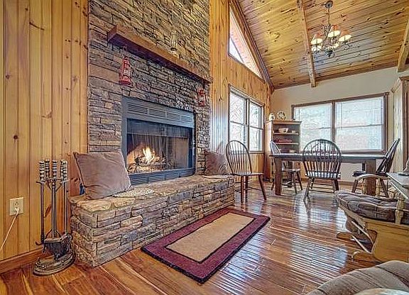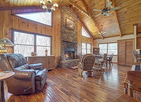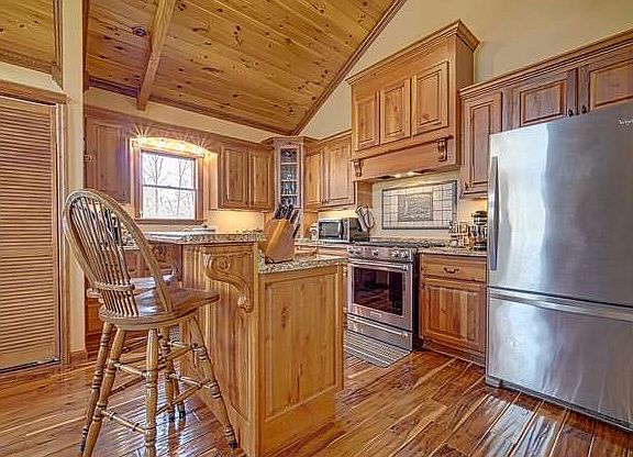 Meticulously maintained 2/2 cabin - perfect set up for extended family large bedroom and full bath on each level. Both levels have kitchens (the main kitchen is custom from All Custom Cabinetry in BR) and their own laundry. Prepared to be WOWED by the African Walnut hardwood flooring on the main. There is a covered open air porch for soaking up the cool mountain air. The lower level is walk out with a great screened porch and private access. Under the deck is a climate controlled root cellar. The house has raised bed gardens, and two outbuildings that stay. Also, a nice matching outdoor play set. Metal carport also conveys. There is an RV hookup (its own septic and electric and water are run from the cabin). This home is not to be missed -