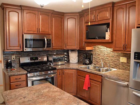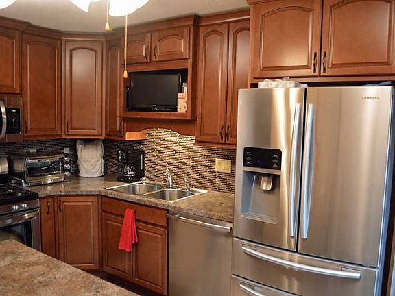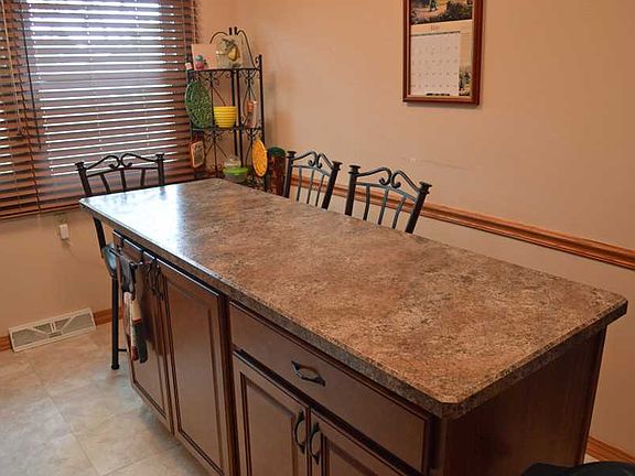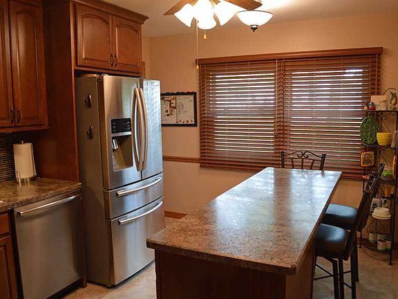 Wow, this kitchen! Completely remodeled kitchen comes with gorgeous cabinets and counters, backsplash, stainless steel appliances, island with seating, built in space for a tv, custom blinds and new flooring. The rest of the first floor offers a formal dining area, living room with a bay window, full bathroom and half bath off the master. The lower level provides the perfect place to entertain with a large family room, custom bar with saloon doors and a fridge and a wood burning fireplace. Large lower level storage room, 2 stall attached garage, fenced in back yard with a patio and storage shed! Very well maintained over the years. This home is truly one of a kind.
