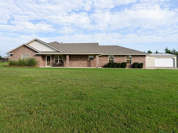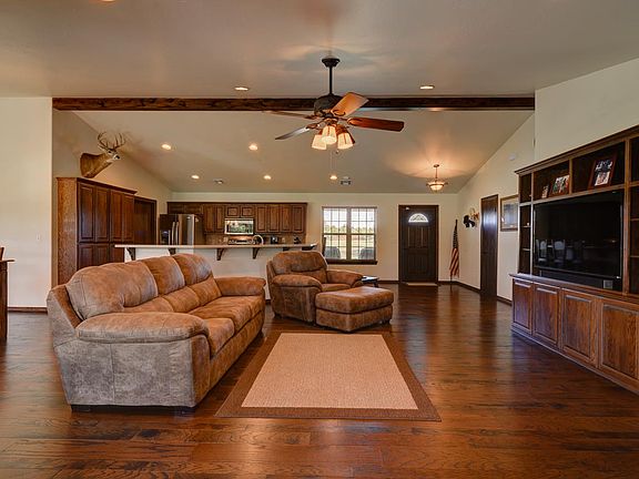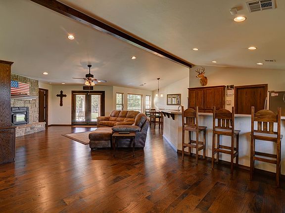 GREAT COUNTRY SPACE!!! Open the door to a large beautiful open floor plan with wonderful wood floors, great for family living or entertaining. Large kitchen features Corian counter tops and eating bar with stainless appliances. Living room features built-ins and a large rock fireplace with wood stove with variable speed blower. Fireplace is double sided with a rock fireplace in the master bedroom, on the back side (wood stove could be removed and returned to a working double sided fireplace). Large covered patio within the post rail fence with black epoxy coated chain link; great patio for entertaining! Wonderful large 30 x 24 insulated shop building with full electric with multiple outlets, overhead door and shelving in the workspace area. Additional amenities include: full gutters & down spouts on the house that are all plumbed into an underground french drain system, foundation was poured with piers on 8' centers when built, wired speakers for front and back porch, cable/tv ready on the back patio, over-sized garage for those extra long pickups @ 26' x 25'4" with 18' door, full concrete driveway and approach, in-ground garage storm shelter 4-6 people with all weather magnetic cover. All of this sits on 1.17 acres. Immaculate condition. Don't miss out on this one.