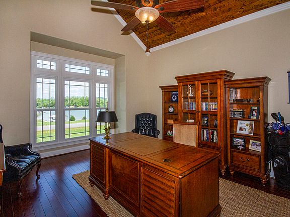 This home is a custom build home for one owner! Simply stunning and you will feel like you are home in this beautiful house.The front porch has stamped concrete and is so inviting. Sit on your front porch and enjoy the view of the lake. Hardwoods and tile throughout. The back of the house is as pretty as the front of the house. Lots of light throughout. Open Floor Plan. Nice arched gas log fireplace in Family Room. Huge Master Bedroom that leads to back deck. Nice Big Office with a view of the lake. Every Bedroom has its own full bath. Custom Maple Cabinets throughout.Big Island in Kitchen with bar eating. Gas cooktop. Look at the nice sailboat weather vain on top of house. This home is a must see with lots of features you will love. Call today as this one will not be there long