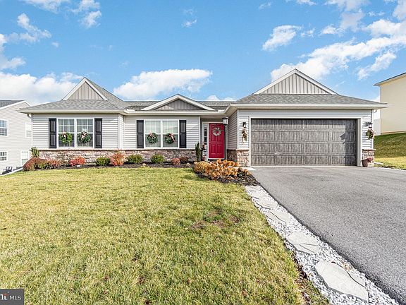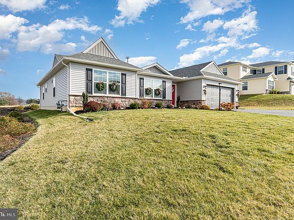 One-Level living in Dillsburg! This 3 bedroom/2.5 bathroom ranch style home was built in 2021 and features picturesque mountain views from your front porch! The floor plan includes a private front office with french doors, a convenient half bathroom and seamless flow into the living room, kitchen, dining room, and sunroom. The spacious open concept is perfect for everyday living or entertaining guests. The kitchen is the heart of this home offering upgraded cabinets, granite countertops, stainless steel appliances, 5-burner gas range, and a center island with breakfast bar seating. Mudroom off the kitchen leads to a 2-car garage. Living room includes a cozy gas fireplace and ceiling fan. Dining area provides a chandelier and plenty of room for a long table. Luxury vinyl plank flooring extends from the front foyer into all main living areas of the home. Large windows with custom blinds have also been added throughout the home. The bright sunroom with a vaulted ceiling, offers incredible natural light and a perfect place to sip a cup of tea while enjoying a good book. Sliding glass doors lead to the back patio with added pavers, along with plenty of fresh professional landscaping and grading, and a new storage shed. Back in the home the hallway leads from the living room to a convenient laundry/storage room, 3 bedrooms and hall bathroom. The primary bedroom suite offers a private double door entry, a walk-in closet and two additional closets. Primary bathroom includes low-entry stall shower, linen closet and double vanity. There are two additional spacious bedrooms with more closets, a hallway bathroom with tub/shower combo, and additional closet in hall. Northern York School District. Convenient access to Rt. 15., local restaurants, local shops, and schools. Make it yours today!