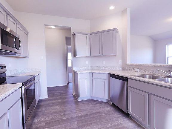 This particular home starts with a hallway entrance and 2 bedrooms off to the side with their own guest bathroom. The hallway opens up to the kitchen/living room area with a dedicated space for the kitchen table. The master bathroom will have a soaker tub and walk-in closet. The cabinets are gray with a light colored countertop and stainless appliances are in the kitchen. There will be a raised 9 foot ceiling in the hallway, living room and kitchen. It also comes with a covered back patio.