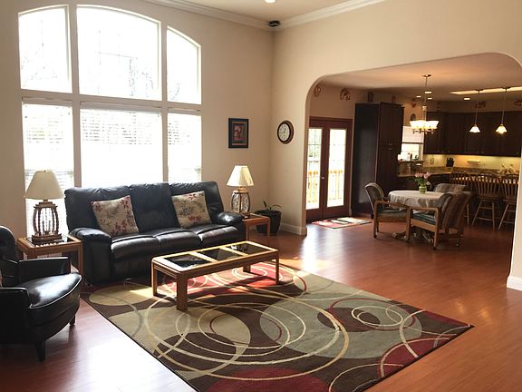 Lots of WOW to this custom home. The sellers were very thoughtful when designing and building this home. Gorgeous entry door w/ side lights, huge living room with 12 foot ceilings and crown moulding. A double sided gas fireplace that can be seen from living room and master bedroom, the kitchen with granite counters, tons of cabinets (many with pull out shelves) updates stainless appliances, with a cook top in the center island, a breakfast bar and an open concept dining room area. This home also boasts a separate den/office, huge patio great for outdoor entertaining, a large garden shed and mature trees. A very fun feature is a regulation size Shuffle Board. A 2 car garage with an extra deep 56 ft stretch for a 3rd car, a boat or shop space. plus a half bath. A must see!