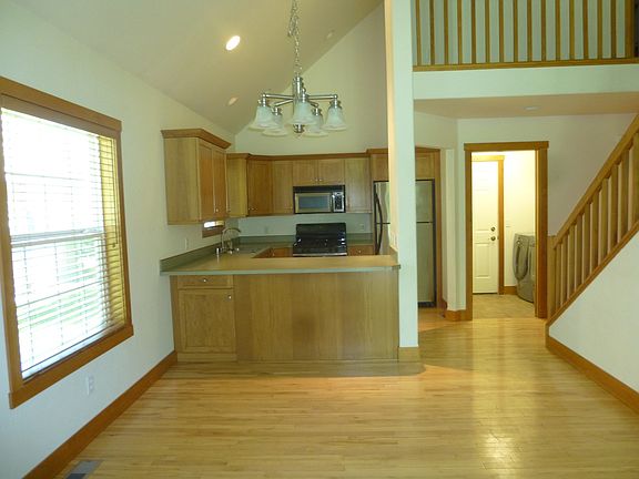 Fabulous townhome near Grouse Mountain Lodge with three bedrooms and 2.5 bathrooms on two floors. Beautiful wood floors throughout the main level and a two car attached garage. Vaulted ceiling in the living and dining room area. Living room boasts a great gas fireplace and the back deck is through sliding glass doors and out to the small yard with open land behind you. The master bedroom downstairs is large with en suite bathroom and double closets. There is a half bath, kitchen and laundry room on the main level. Upstairs is a little sitting area and the two additional bedrooms that share the upstairs bathroom. Attached garage and a bit of landscaping in the front of the townhome. Available July 1st for a year lease.