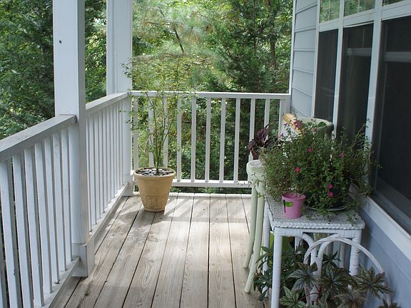 Covered porch. Hardwood style plank flooring in living/dining and bedrooms. Combined living/dining: fireplace, exit to deck. Kitchen: white cabinets, granite countertops, tile backsplash, pantry. Master bedroom on 1st, walk in closet, entry to combined master/shared bath; vanity in each, tub/shower in master, washer/dryer in shared, tile flooring. 2 bedrooms up with double door closets. Jack & Jill bathroom, tile flooring. Deck. Stone patio. Pet w/fee, prior approval. $15/mo filter fee.