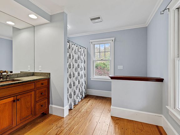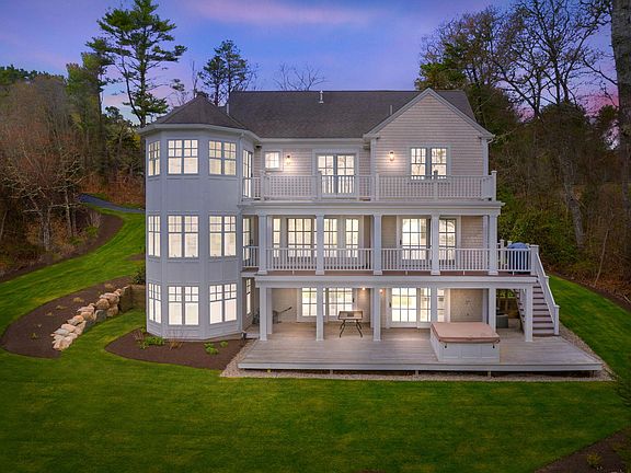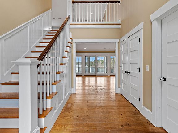 Gorgeous waterfront home, with a private beach on Triangle Pond. Sitting back off the road, with plenty of parking, a beautiful lawn, stone walls, and a farmer's porch, it's a private oasis you'll never want to leave! Once you step through the front door, you will be blown away by the entryway with 17' high ceilings, an open stairway to a 2nd floor mezzanine, wide southern pine floors that continue throughout the home, and views of the pond. Straight back you'll find a large open kitchen/dining area with custom cabinetry, granite tops, farmers sink, a six-burner stove, with a griddle, a huge island with a vegetable sink and a breakfast bar and stunning views. The kitchen opens to a large living room, also situated to take full advantage of the sweeping views. Sit and enjoy the warmth of the fireplace, with its gorgeous mantel and flanking built-in cabinets/bookshelves or take in the views, surrounded by windows in the sitting area. A sliding door leads to the expansive porch overlooking the rear yard and pond. A good-sized bedroom and a large full bath finish off the first floor. On the 2nd floor you'll find a large mezzanine that can be used as a sitting area and home office and opens to a 2nd level porch. To the right is the primary suite, featuring walk-in closet and a sitting area, surrounded by glass to take advantage of the views, a private bath with a large custom tile shower w/multiple shower heads and jets, an expansive wood vanity w/marble top and two vessel bowl sinks. A 2nd bedroom and a full bath round out the 2nd level. The walk-out lower level features a wall of glass overlooking the pond and yard and a sliding door to the rear deck and hot tub. The floor is plumbed for radiant heat, so this level is ready to become an amazing space for entertaining.