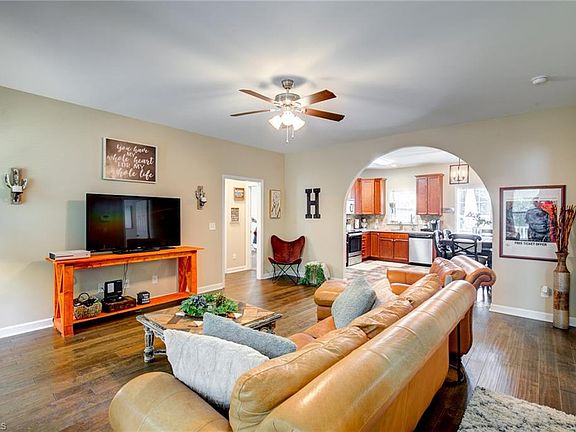 Split bedroom layout home on 1 acre lot. Rocking chair front porch. Open plan with arched entry from living room to kitchen & dining area. 9' ceilings throughout. Kitchen features SS appliances and stone backsplash. Dining room leads to 10x12 back deck. Master bedroom with large WIC and ensuite with dual vanity. Ceiling fans in all bedrooms. Tall crawlspace for additional storage.