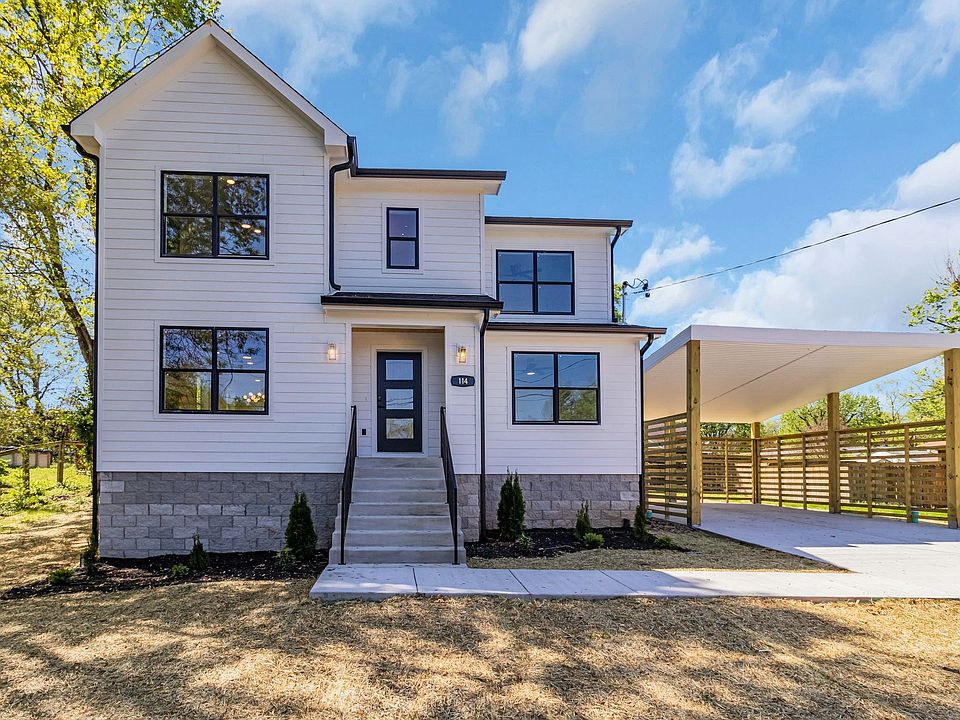 Stunning Rare New construction opportunity in the heart of Old Hickory next to Hermitage Golf Course and Old Hickory Lake on a flat lot! Newly built on one of the few remaining vacant lots in this neighborhood, and constructed by Stonegate Contracting, this home features 1726 square feet, 4 en suite bedrooms and 4.5 bathrooms, and a detached two car carport. All bathrooms are fully tiled, with engineered hardwood floors and luxury fixtures. Custom thin set shaker cabinets with satin bronze hardware accompanies the kitchen along with a full stainless steel appliance package. Custom trim and accent walls- No corners were cut here with 2x6 walls, dual HVAC units, spray foam insulation, hardie siding and black windows. Unbeatable features for under $500,000!