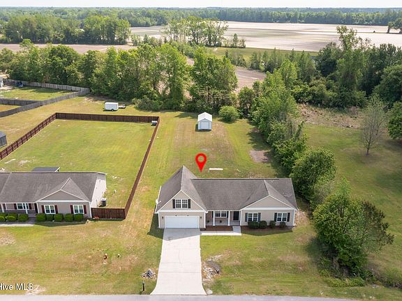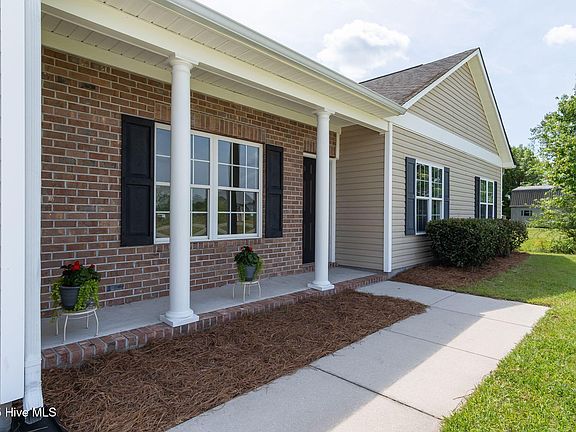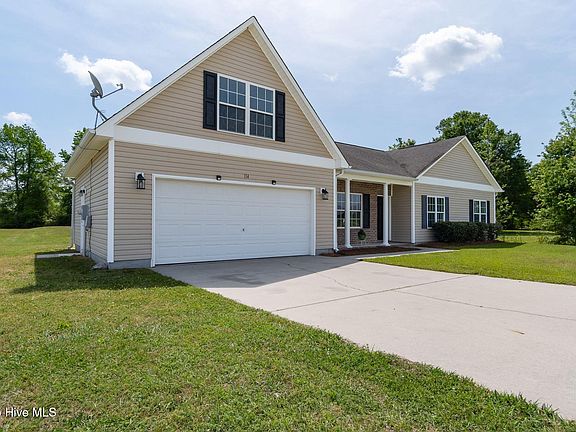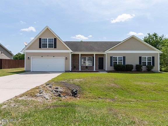 114 Hardin Drive is situated in the peaceful White Oak Plantation subdivision of Maysville. You are greeted by a welcoming covered front porch which offers up the perfect spot for rocking chairs and refreshments. Step inside to find a freshly painted open floor plan layout, boasting an inviting living room with vaulted ceilings and a cozy fireplace, as well as a combination kitchen and dining area showcasing plenty of cabinet space, a kitchen island and a new refrigerator. This home offers 3 bedrooms, 2 baths, convenient laundry closet, a bonus room which could make the perfect home office, playroom or gym, and a convenient attached 2-car garage. The large master bedroom includes an en-suite bathroom with a double sink vanity, soaking tub and a walk-in closet. Outside the expansive backyard features a patio and an extra-large shed, providing storage for all your tools and yard supplies. This backyard is sure to be a favorite spot for gardening, gatherings and more. Conveniently located between Cherry Point and Camp Lejeune, this home offers both tranquility and accessibility.