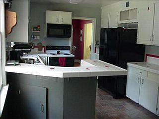 Both bathrooms have been refurbished. Office/den has cracked tile flooring & separate heat/air from main house.Plenty of closet/storage area. master bdrm has two closets. Detached garage w/extra storage as well.Great room has lovely flooring, bookshelving, and is very large. Kitchen has wonderful breakfast bar area.