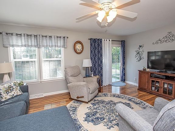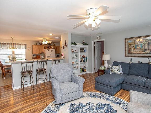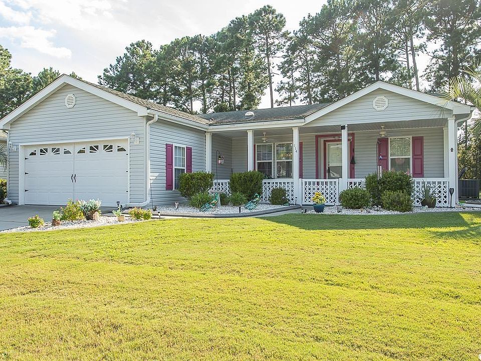 MOTIVATED SELLER! Beautiful, well-maintained Lakeside Crossing ranch with large rocking chair front porch conveniently located at the front of this desirable gated community and close to the amenities center. THESE HOMES ARE ON PERMANENT FOUNDATIONS. This is one of the first ones constructed and has an additional 400 sft over other later models. This  55+ (age -restricted) community has tons of organized activities and amenities including indoor and outdoor pools, tennis, party room, craft room, hot tub, fire pit, paddle boats, kayak dock, fish pond, pickle ball, putting green, fitness center, library, billiard room w/ bar, organized exercise classes, yoga, ballroom dancing, bingo &more at their award-winning Community Center --ALL INCLUDED in the lot fee. Fee also includes trash and lawn care. This is NOT an HOA.  Home is immaculate and has new Lux vinyl plank flooring throughout, newer heat pump (2019), newer Washer and Dryer (2019),  built ins in liv room, extended height bathroom vanities, walk in shower and double sinks in Master, walk in closets, large eat in kitchen, breakfast bar,  spacious bedrooms in a desirable split floor plan and full laundry rm, plus 2 car garage. Backs to wooded area for privacy. Be sure to visit the 2 impressive CLUBHOUSES and to get a copy of the newsletter and info on the activities, lot rates, etc.  There is NO property taxes paid by owner on these homes.