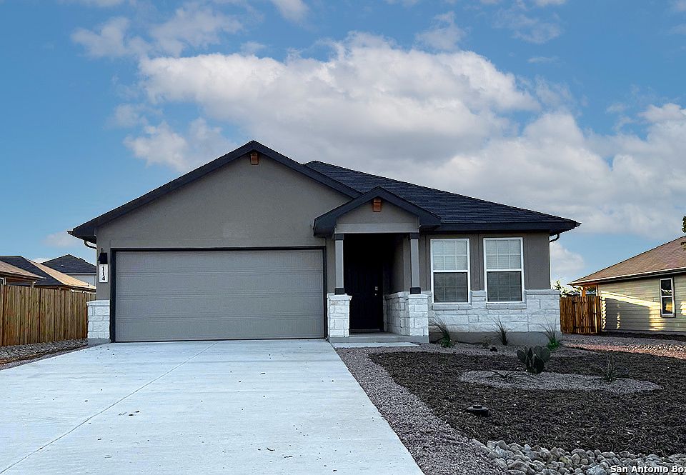 Welcome to The Knight, our largest single-story home offered at High Garden in Comfort, TX. Featuring 3 classic front exterior, 4 bedrooms, 2 bathrooms, 2-car garage and 1901 square feet of living space, this floor plan is sure to turn heads. Spacious, comfortable living greets you at the door with a long foyer leading to a decorative wall nook and a grand, open concept living room, kitchen and dining area. The kitchen is complete with beautiful quartz countertops, stainless steel appliances, classic white subway tile backsplash, and an oversized kitchen island with a deep single basin sink. Your blended living room and dining area feature luxury hard surface flooring and plenty of windows, creating a light and bright space for living and entertaining. The private main bedroom is located at the back of the home and features a large, relaxing ensuite bathroom complete with a separate tub and walk-in shower, dual vanities, a water closet, and spacious walk-in closet. All secondary bedrooms offer quality carpeted floors and a closet. These rooms are versatile! Use them as bedrooms, offices, work out rooms or other bonus spaces. Additional features include tall 9-foot ceilings, 2-inch faux wood blinds throughout the home, ceramic tile in the bathrooms and utility room, and pre-plumb for water softener loop. You'll enjoy added security in your new home with our Home is Connected features. Using one central hub that talks to all the devices in your home, you can control the lights, thermostat and locks, all from your cellular device.