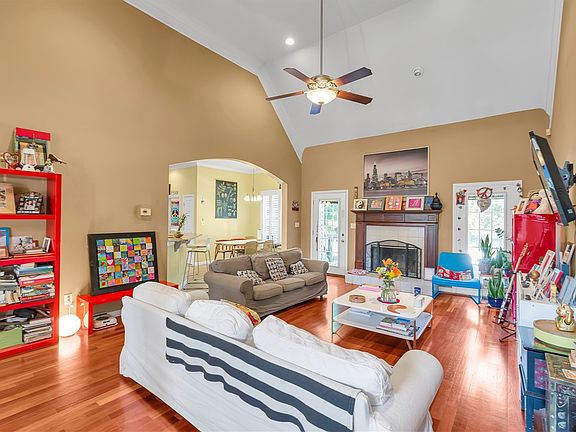fireplace and flooded with natural sunlight. An arched entry into the formal dining area