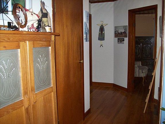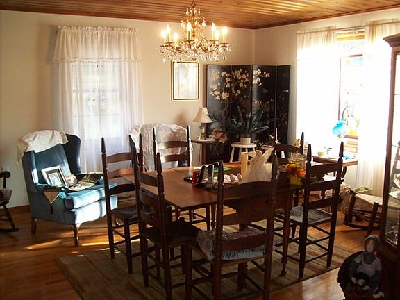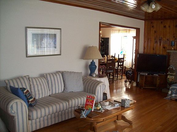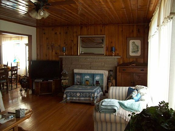 Come look at the views from the front deck and living room of this 3 bedroom 1 bath house. The mountains and golf course make a great view. It has an eat in kitchen, large dining room / den, living room with a stone fireplace, and a full basement with a one car garage.. Also included are hardwood floors, ceilings made of knotty pine, a heat pump with central air, front and rear decks, paved driveway and plenty of parking in front. Come see this one its in walking distance of down town.