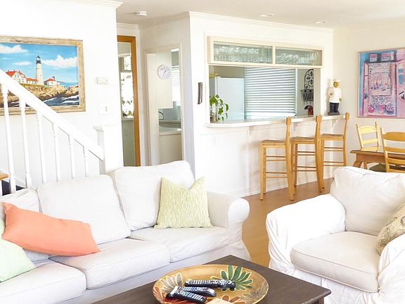 Gas fireplaceCharming front brick patioDutch doorsLight-filled roomsSlip-covered furnitureFlat-screen tv in denWhite walls